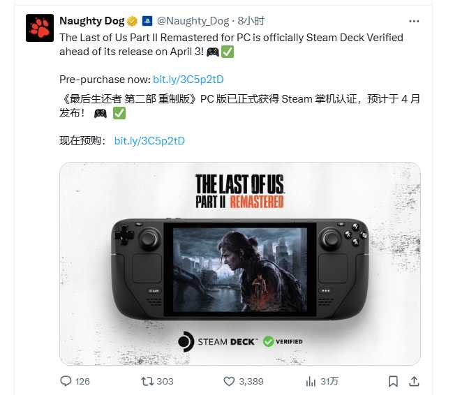Recently, Naughty Dog has officially announced that "The Last of Us Part II: Remake" has passed the Steam Deck certification. The game is scheduled to be released on April 4, 2025, and will be available on the Steam and Epic platforms. The price of the game in the Steam China region is 345 yuan, and it supports Chinese.