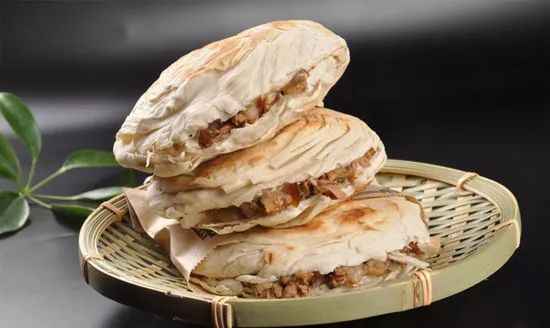 Roujiamo is a classic snack from Shaanxi Province, China, with various regional variations. In central Shaanxi, the most representative type is "lazhi roujiamo," which uses Baiji (a type of flatbread) and is filled with braised pork belly. In the Xifu region of Baoji, "meat" (minced meat sandwich) is popular, featuring minced meat as the main filling. Tongguan roujiamo stands out with its unique preparation: the bread is baked to have a crispy outer skin and a soft, layered interior, creating a distinct contrast with other regional styles.
